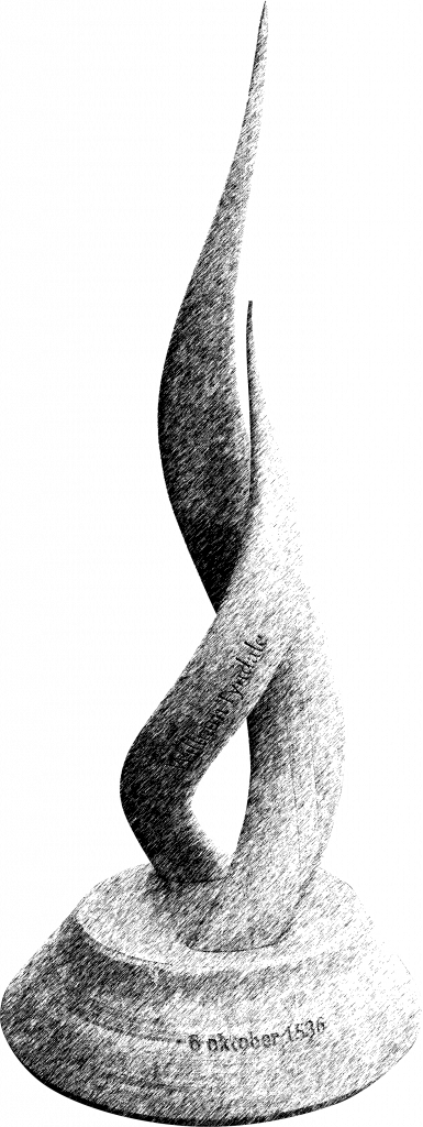 Twee vlammen zoeken hun weg naar boven en verwijzen naar de brandstapel waarop William Tyndale eindigde.