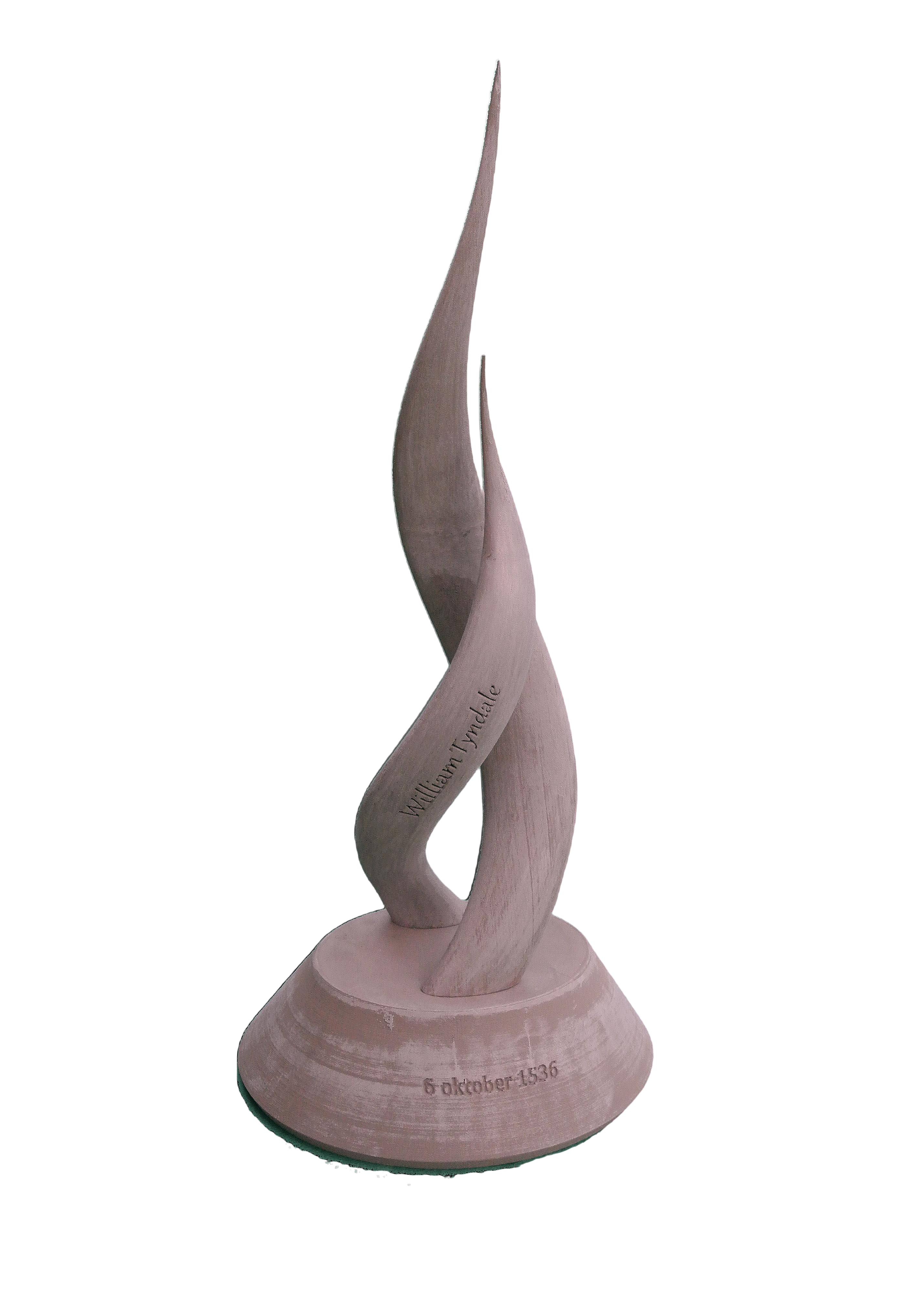 Op de korte vlam staat de naam van William Tyndale. De grote vlam vermeldt “Let there be light”.